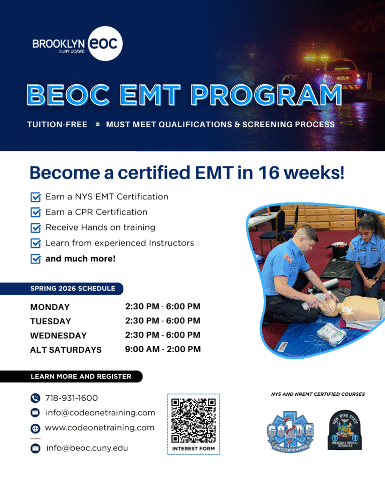 This new program will provide students with essential skills through hands-on-training from EMT professionals. The training will run for 16 weeks in person at Brooklyn EOC. If you are interested and would like to learn more, please complete the interest form below. You will be contacted by the admissions team as updates become available.Â